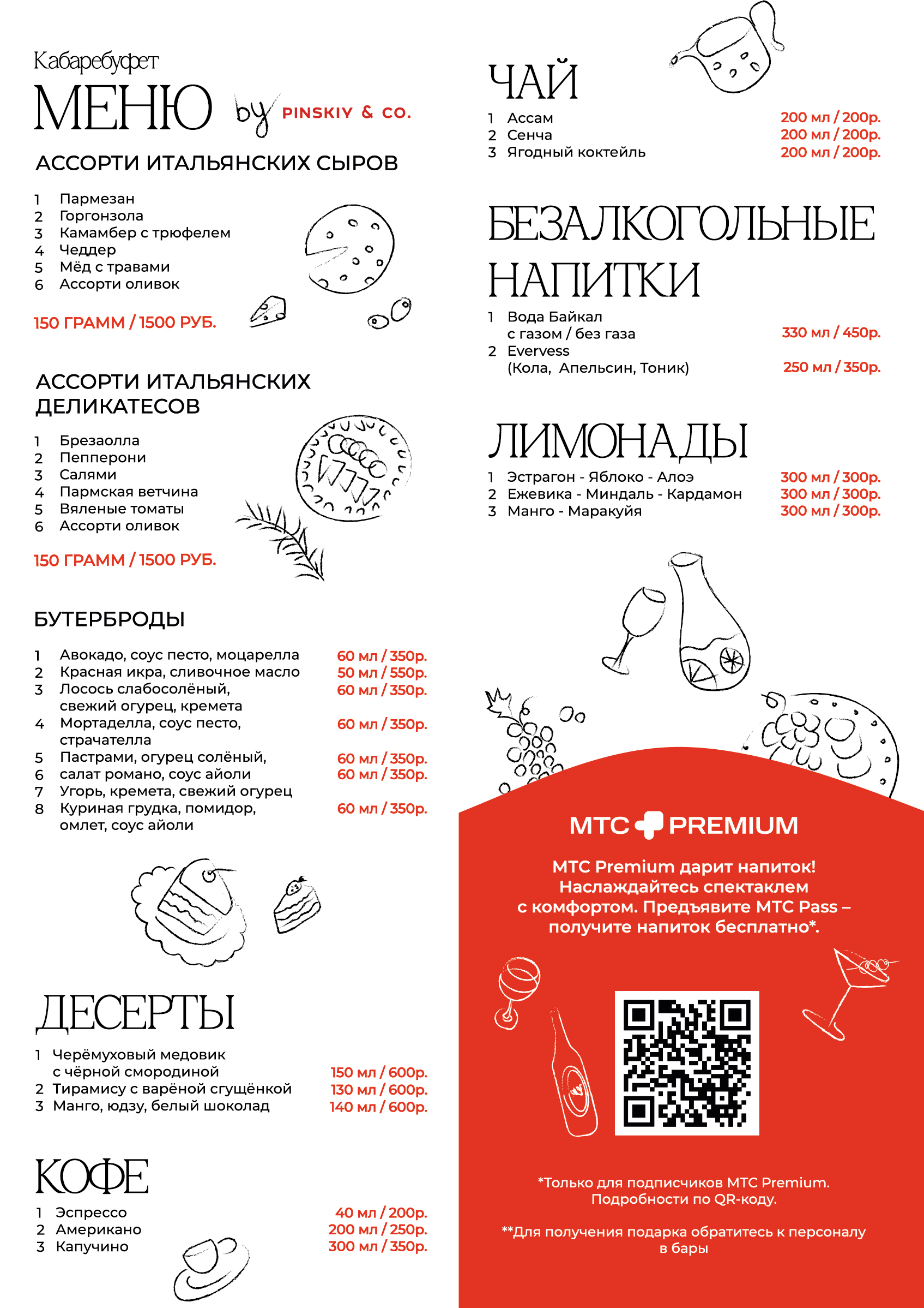 Специально для «Театра на Цветном» шефы переосмыслили вечные хиты театральных буфетов и представили актуальные, модные версии блюд и десертов на любой вкус. Обязательно попробуйте ассорти итальянских деликатесов, нескучные вариации любимых бутербродов или тирамису с варёной сгущёнкой!